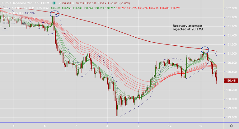Price action hovers around 5-DMA at 130.48, scope for dip till 38.2% Fib at 129.34. Bearish invalidation only above daily cloud.