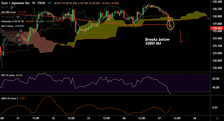 EUR/JPY slumps over 0.50% and was trading at 129.60 at around 08:30 GMT