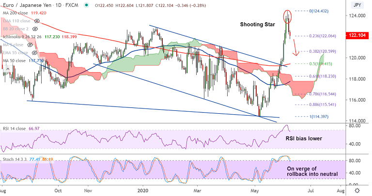 'Shooting Star' pattern on the daily charts is likely to plummet prices further. Oscillators look overstretched and are on verge on rollback into neutral.