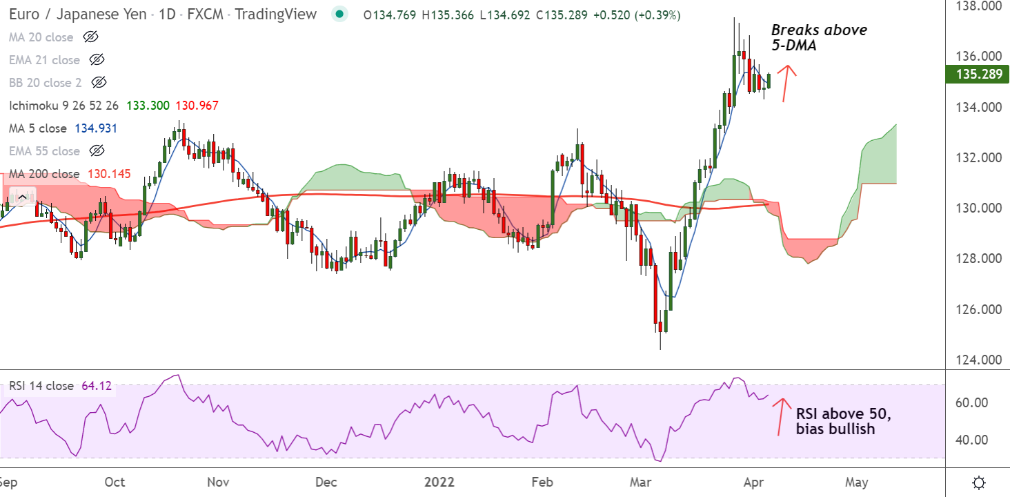 EUR/JPY was trading 0.41% higher on the day at 135.32 at around 12:10 GMT, outlook is bullish.