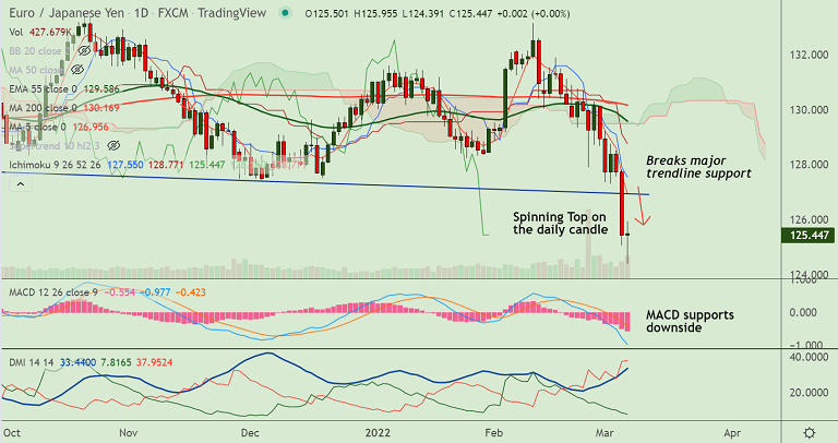 Single currency remains under pressure as the invasion stokes fears of stagflation/recession in the Eurozone, which is more acutely exposed to economic sanctions on Russia.