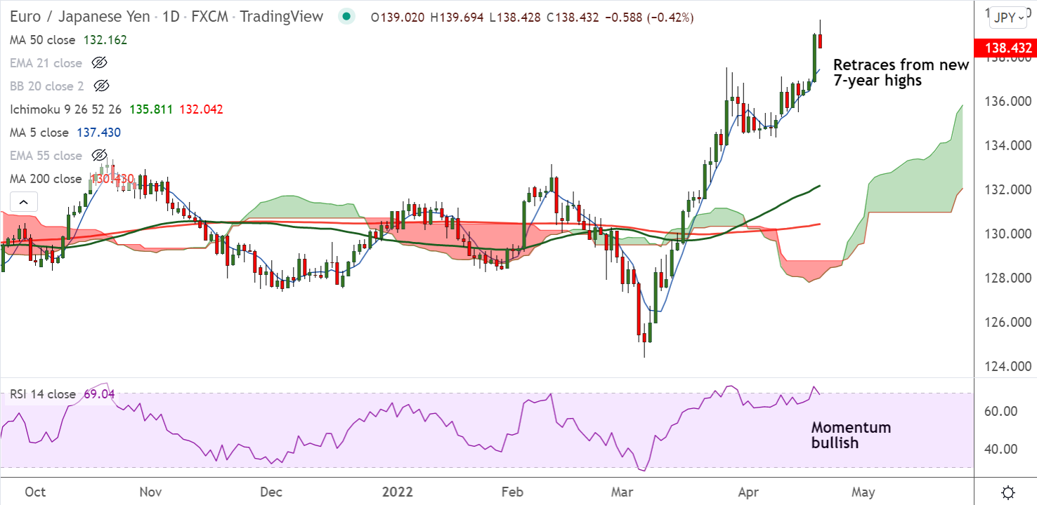 The pair has retraced from fresh 7-year high at 139.69 hit earlier in the day, upbeat Eurozone Industrial Production data fails to impress.