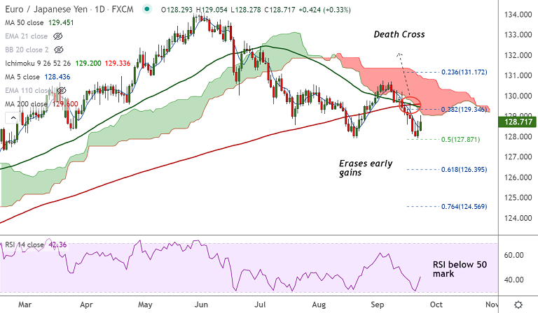 Major trend in the pair is bearish. 'Death Cross' on the daily charts weighs on the price action and keeps upside limited.