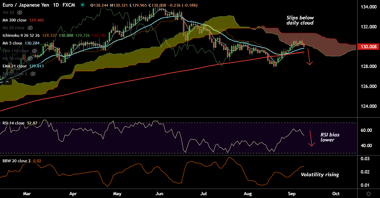 The pair has broken below 55 and 110 EMA support, upside remains capped at 5-DMA which has turned south.