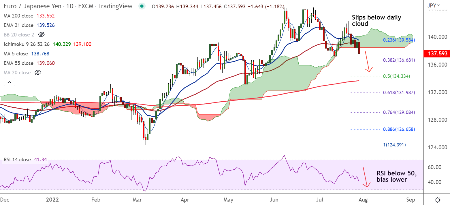Summary: EUR/JPY break below cloud has opened downside in the pair. Scope for test of 38.2% Fib at 136.68.