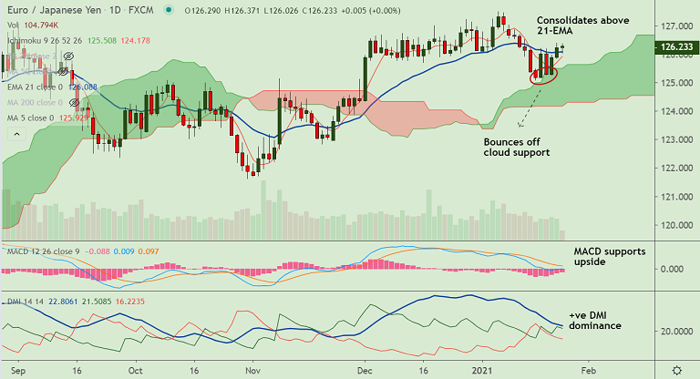 Daily cloud offers strong support at 125.64. Break below will drag prices further lower. Break above 20-DMA negates bearish bias.