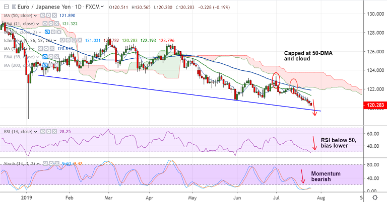 EUR/JPY trades with a strong bearish bias, scope for weakness till 119.80 (trendline support).