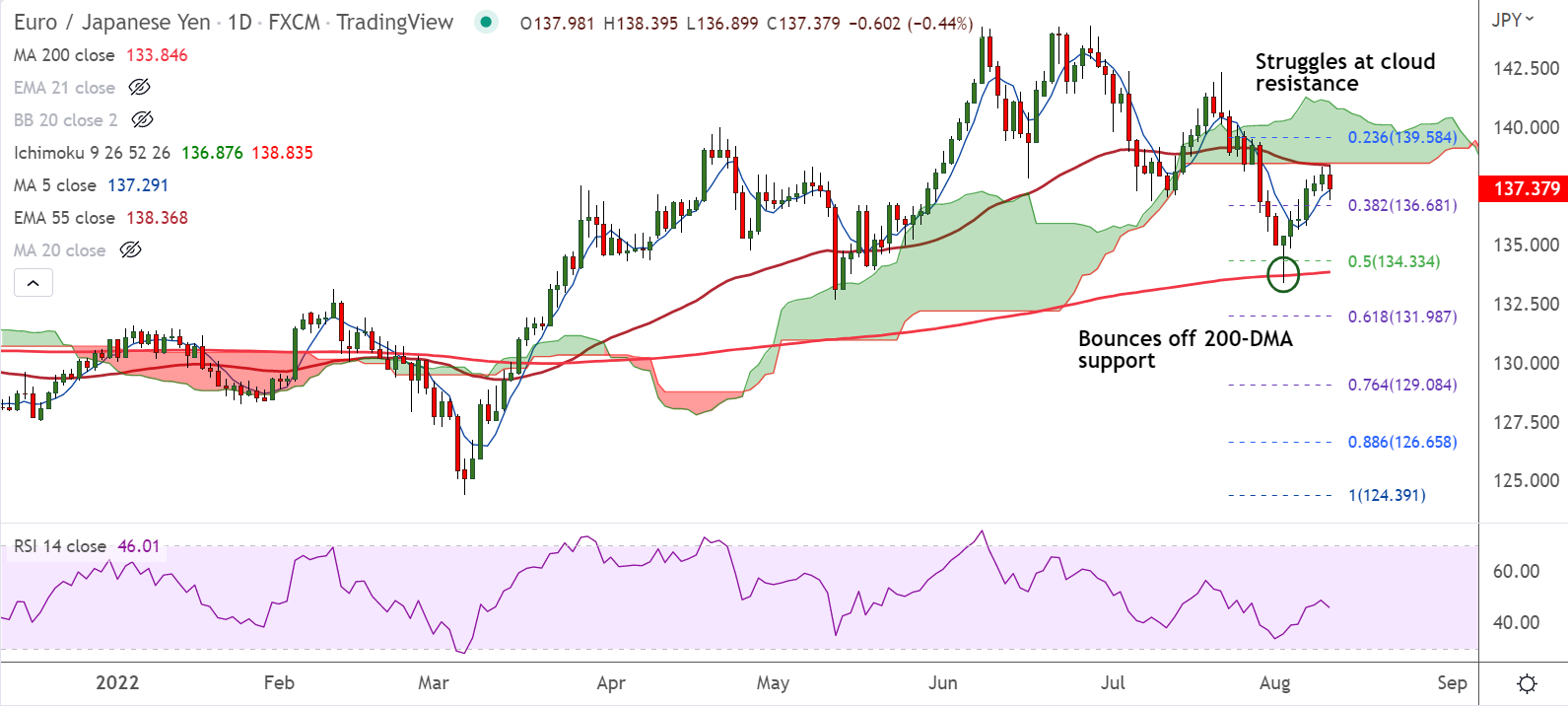 Summary: EUR/JPY retraces from cloud base and 55-EMA resistance. Further weakness on cards. Scope for dip till 200-DMA. Bearish invalidation only above daily cloud.