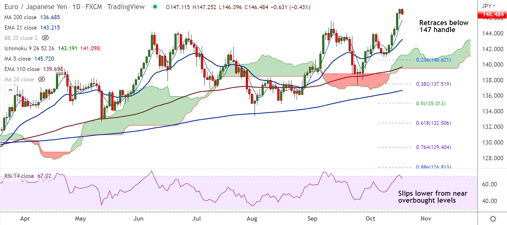 EUR/JPY was trading 0.42% lower on the day at 146.50 at around 10:35 GMT. The pair has snapped a six-day bearish streak and has slipped below the 147 handle.