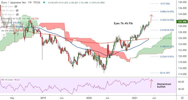 Price action has edged above crucial resistance at 200-month MA at 130.30, raising scope for further gains.
