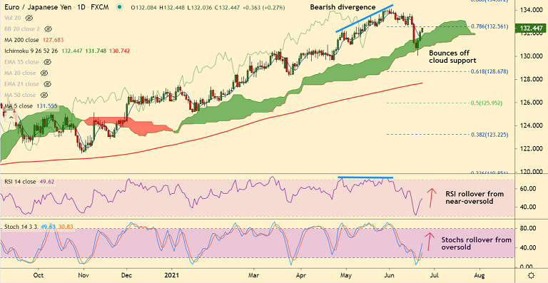 Summary: Major trend in the pair is bullish. Pullback on account of bearish divergence has found strong support at 110-EMA and daily cloud. The pair is hovering around 78.6% Fib at 132.56. Scope for test of 88.6% Fib at 134.87.