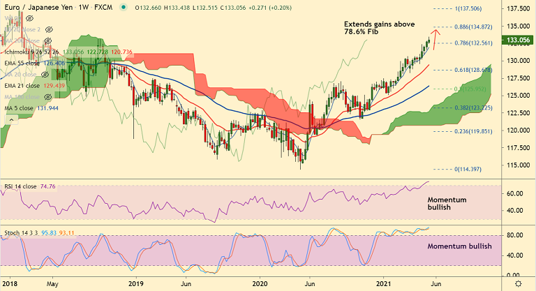 EUR/JPY was trading 0.12% lower on the day at 132.80 at around 08:30 GMT, slipping lower from session highs at 133.20.