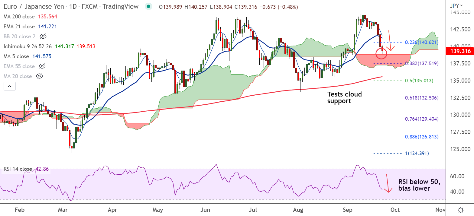 - The pair has retraced below 23.6% Fib and is testing cloud support at 138.83