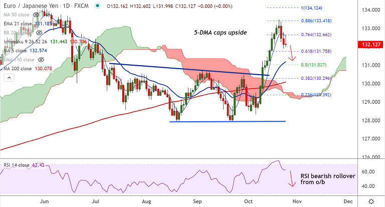 Summary: EUR/JPY set to extend weakness, dip till 21-EMA at 131.18 likely. Retrace and close above 200H MA negates any further downside.