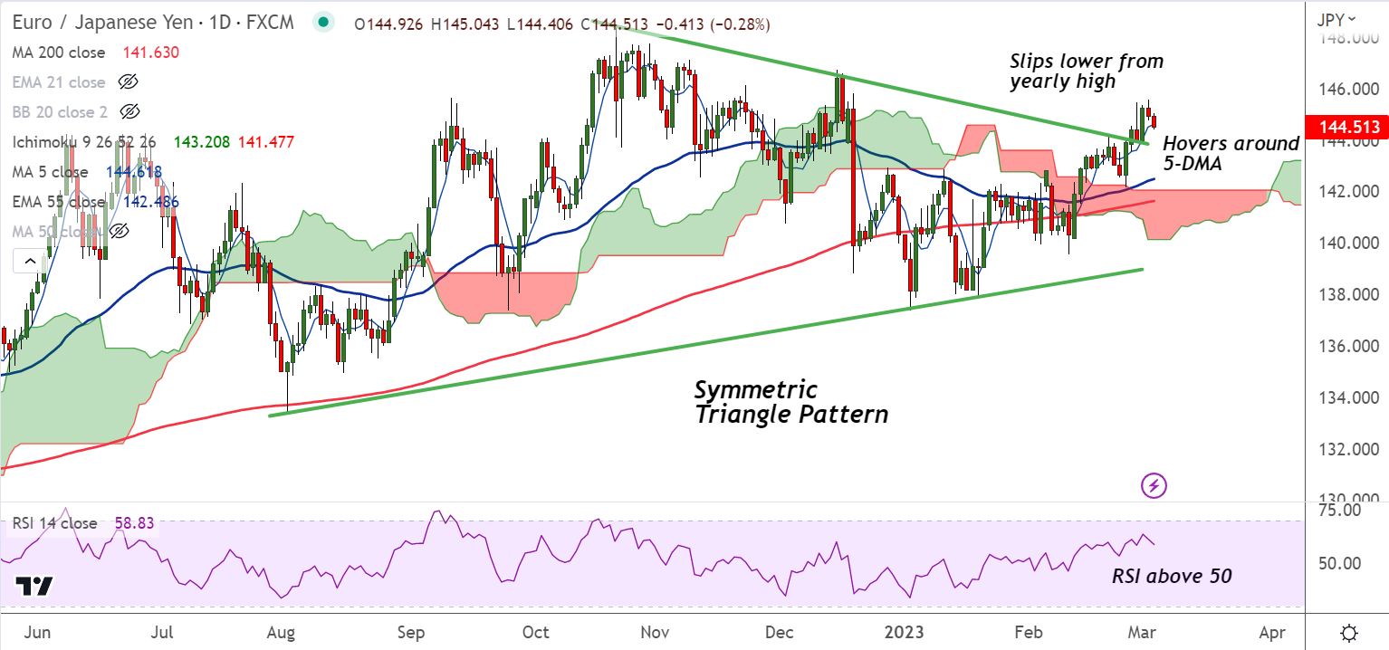 The pair is retracing from yearly high at 145.56, has slipped below 5-DMA as yen pays little heed to weak Tokyo inflation data.