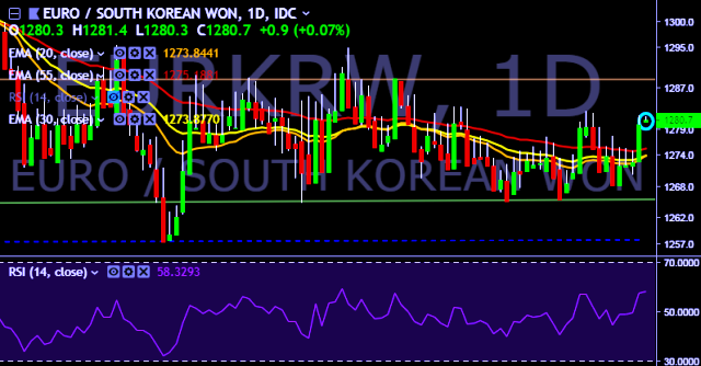 We prefer to take long position on EUR/KRW around 1,280, stop loss at 1,270 and target of 1,294 mark.