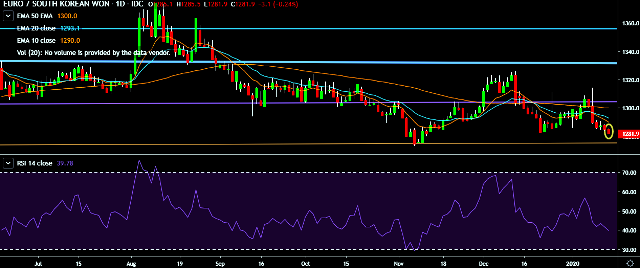 We prefer to take short position on EUR/KRW around 1,283, stop loss at 1,292 and target of 1,274/1,265.