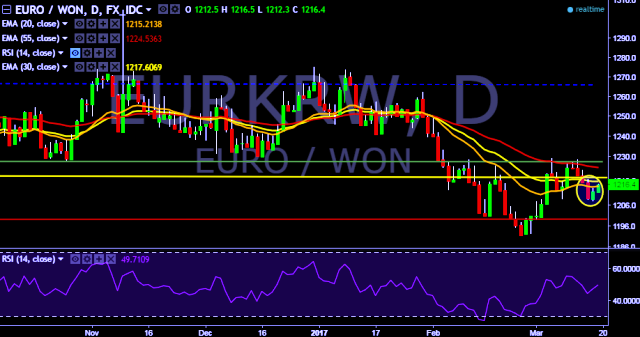 We prefer to take short position in EUR/KRW only below 1,212, stop loss at 1,219 and target of 1,208/1,199/1,191.