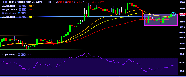 We prefer to take long position on EUR/KRW around 1,320, stop loss 1,315 and target of 1,340/1,358.