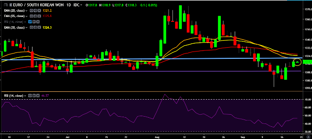 We prefer to take short position on EUR/KRW only below 1,313, stop loss 1,327 and target of 1,302/1,294/1,287.