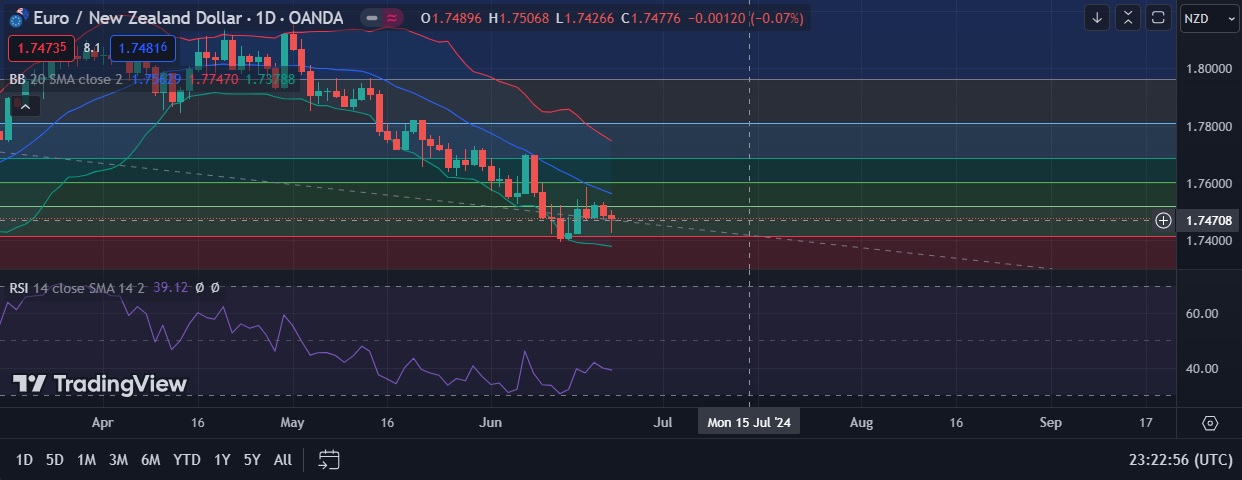 • Strong support is seen at 1.7417 (23.6%fib) and break below could take the pair towards 1.7374 (Lower BB )