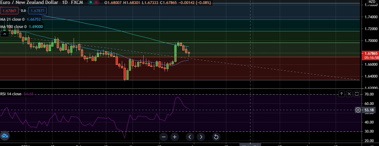 • EUR/NZD fell as low as 1.6736 before buyers returned.The pair was last trading 1.6790 down 0.06% at 16:27 GMT.