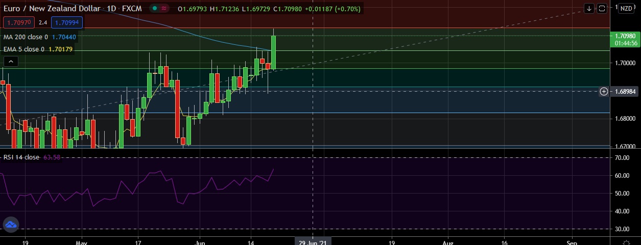 •Immediate support is seen at 1.7044 (38.2% fib) and break below could take the pair towards 1.7017 (5EMA).