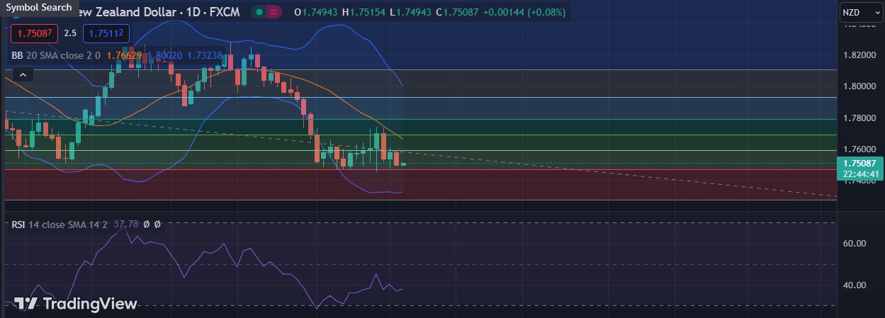 • Strong support is seen at 1.7469 (23.6% fib) and break below could take the pair towards 1.7320 (Lower BB )