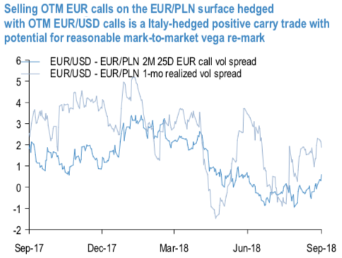 The rationale is two-fold: (a) neutralization of Italian budget risks inherent in selling EUR-cross options; and (b) the long vol hedge is efficient on a standalone basis and does not detract from core short vol P/L: in contrast to the EURPLN surface, OTM EUR calls are priced at a discount on the EURUSD surface, and gamma is much firmer. The net result is a positive carry vol spread construct that has decent potential for mark-to-market gains from a re-pricing of implied vols (refer above chart). Courtesy: JPM