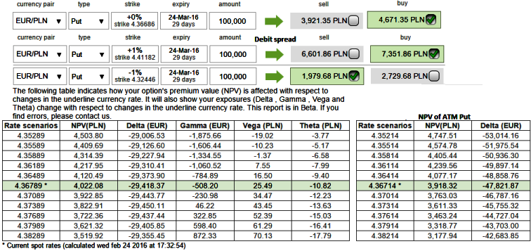 Thus, go long in 1M (1%) in the money 0.61 delta put and simultaneously, short 1M (1%) out of the money put with theta closer to zero for net a debit.