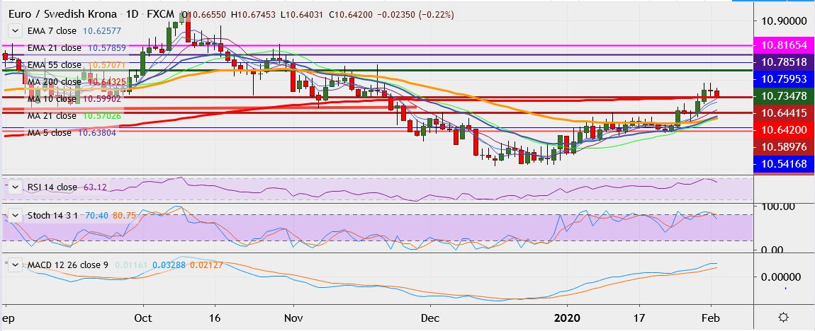 - On the lower side, support is seen at 10.6271 (5-DMA), break below could take it till 10.6203 (7-EMA)