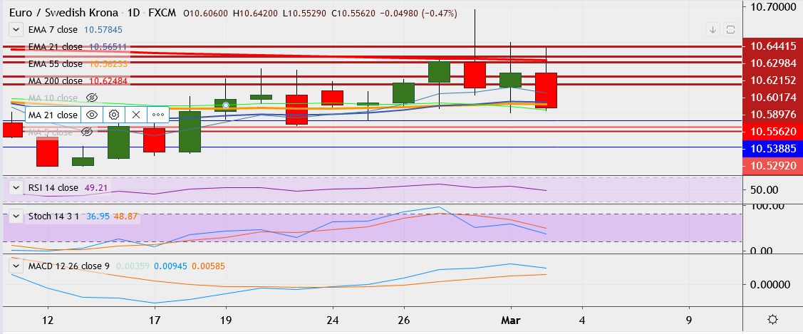 - EUR/SEK trades 0.5 percent down at 10.5546, having hit a high of 10.6961 on Friday, its highest since November 20.