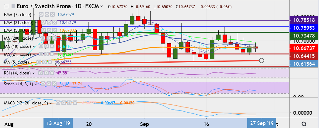 - EUR/SEK trades 0.2 percent down at 10.6556, having hit a low of 10.6399 the day before, its lowest since September 17.