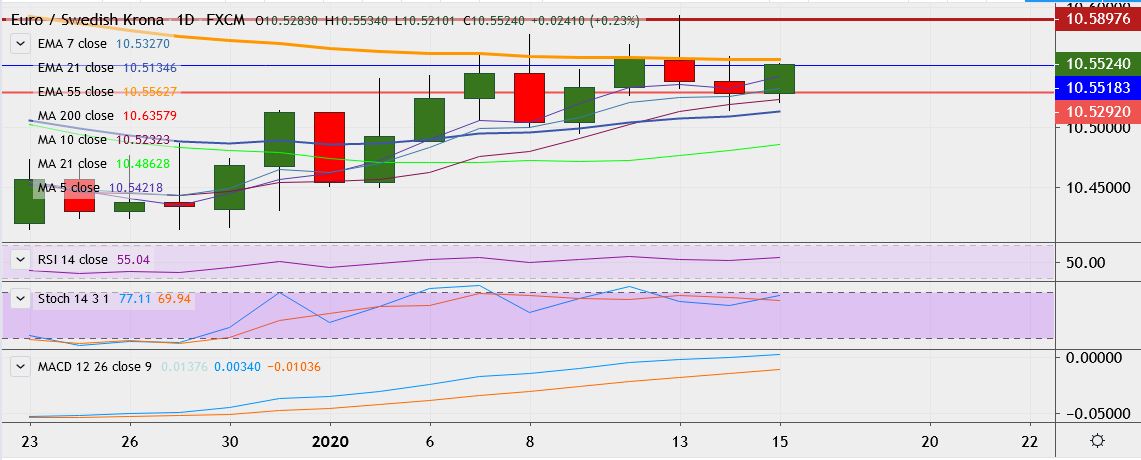 - On the lower side, support is seen at 10.5095 (21-EMA), break below could take it till 10.4948.