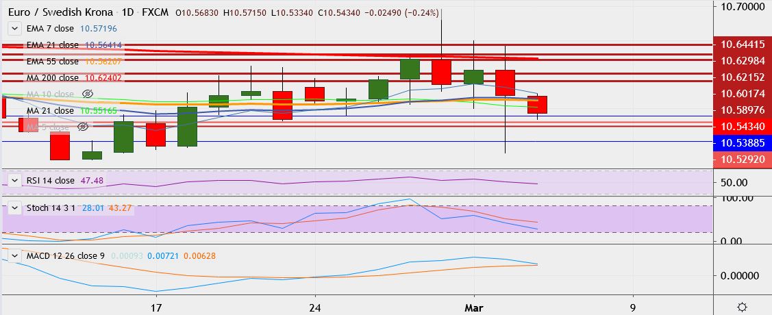 - EUR/SEK trades 0.2 percent down at 10.5450, having hit a low of 10.4847 on Tuesday, its lowest since February 14.