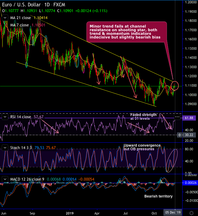 EURUSD’s shooting star is traced out at 1.1077 levels. The bearish pattern sends early signals for minor trend to show failure swings at the channel resistance (refer daily chart).