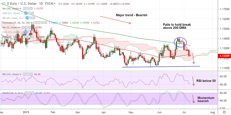 EUR/USD has failed to hold break above 200-DMA, bias is strongly bearish.