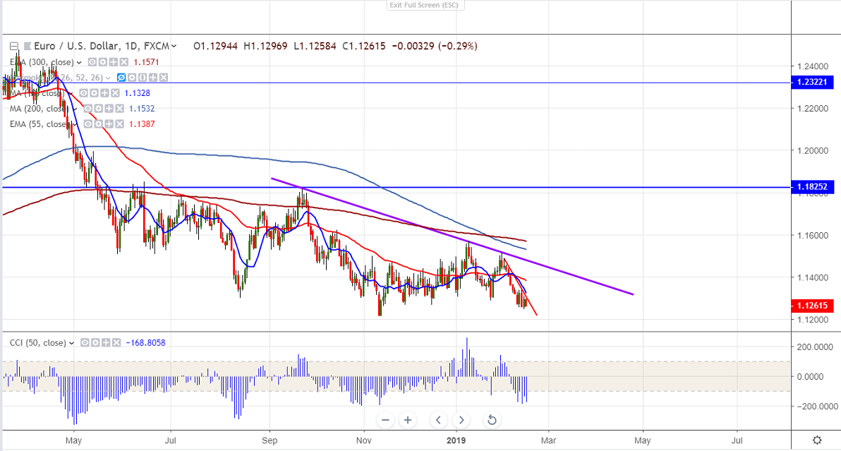EUR/USD is trading below 1.1300 after a minor jump till 1.13098 level yesterday. The pair was trading weak despite weak US retail sales data.US retail sales has declined 1.2% in Dec biggest drop since Sep 2009. Bears are in full control and a dip till 1.1255. The pair hits intraday low of 1.12643 and is currently trading around 1.12674.