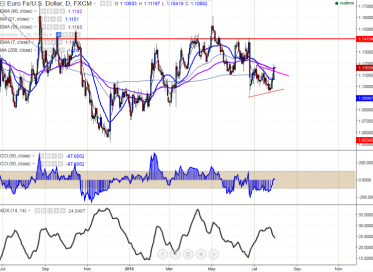 - On the lower side, minor support is around 1.11570 (90 day EMA) and any6 break below targets 1.1100/1.0740 (200 day MA).It should close below 200 day MA for further weakness.