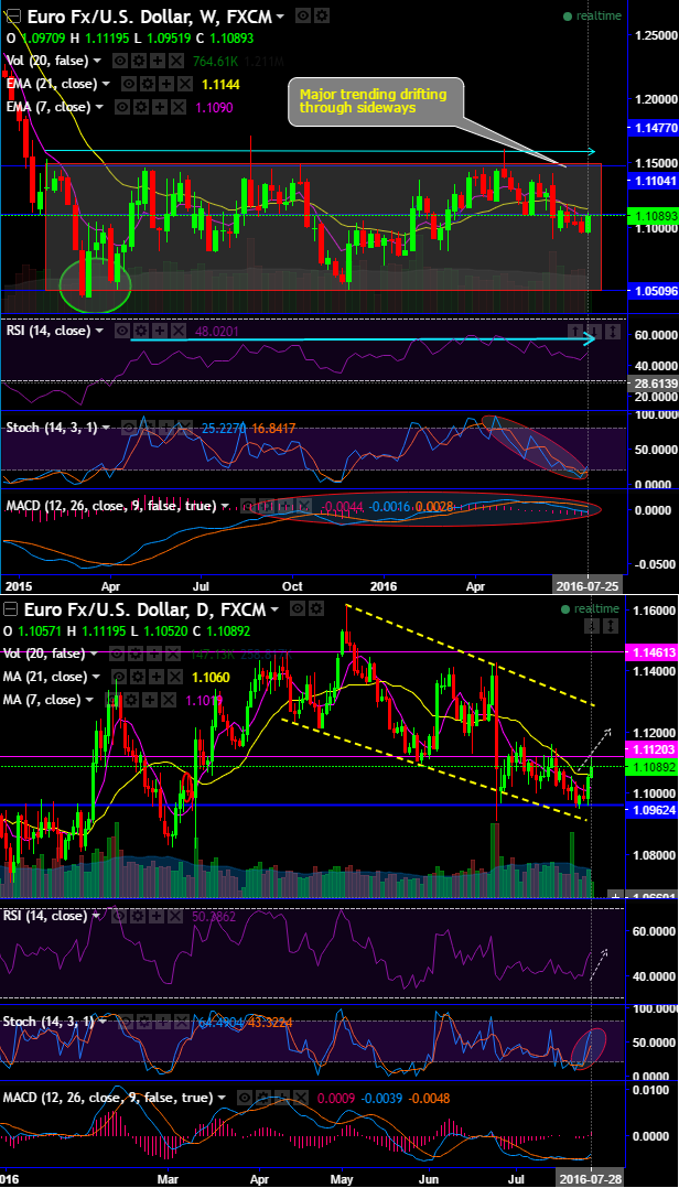 Although EURUSD has gained 0.33% to a two-week high of 1.1095, we think the pair would drift in the sideway trend that has been persisting months to gather (see weekly charts).