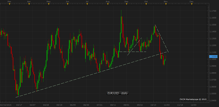 - In spite of stronger commentary from FED in relation to December meeting, weaker than expected economic dockets (GDP for third quarter 1.5%, compared to 1.6% expected and 3.9% prior) posing doubts over the possibility of a rate hike in December. Weaker inflation expectations (survey based), also throwing its weight against Dollar, pushing EUR/USD pair higher.