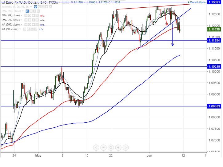 - The pair broken trend line support at 1.12295 and is trading slightly below that level. It confirms minor weakness and decline till 1.1100 (May 30th 2017 low) is possible. Any break below 1.1100 confirms bearish continuation.
