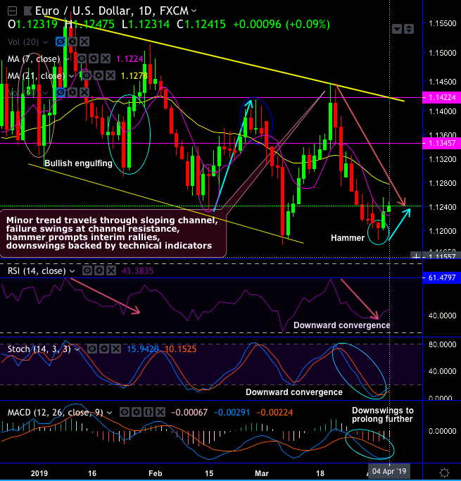 The bullish streaks are observed 2-3 days in a row upon the formation of the hammer pattern candle at 1.1204 levels. However, the interim upswings are not backed by the momentum indicators nor by trend indicators; the current prices are spiking above 7-DMAs that may drag mild rallies but certainly, it should not be deemed as a reversal of the major trend which highly bearish (refer daily chart).