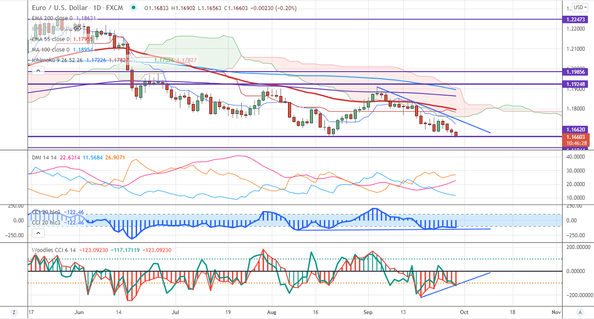 EURUSD continues to trade lower and hits fresh yearly lows on board-based US dollar buying. The decrease in risk appetite is due to Chinese Evergrande's default risk and US debt ceiling concern. The surge in US treasury yield also supporting the greenback. Markets eye US Fed chairman Powell speech and CB Consumer confidence for further direction. It hits an intraday low of 1.16563 and is currently trading around 1.16611