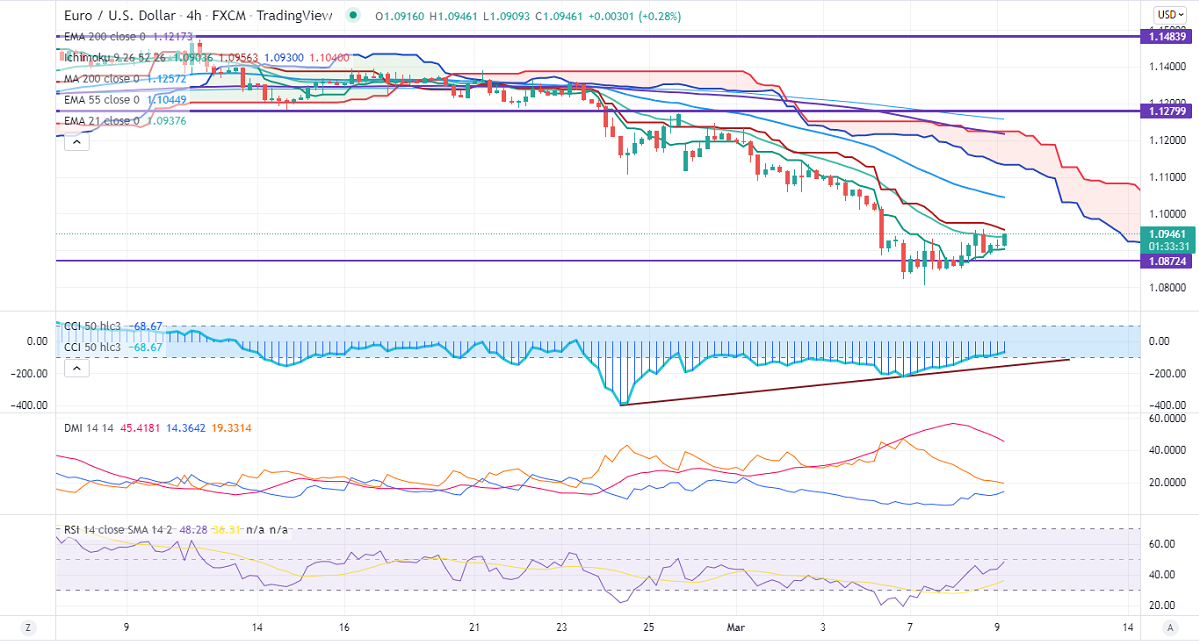 EURUSD trades above Tenken-sen (1.09019) and below Kijun-Sen (1.09638).