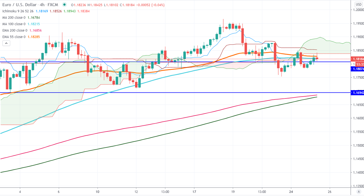 The 4-hour chart shows that the pair is trading slightly above 100 MA and any violation above 1.18500 confirms intraday bullishness. A jump till 1.1900/1.1920 likely.