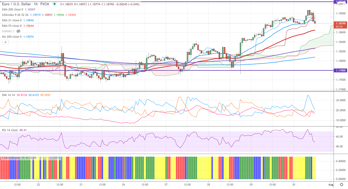 EURUSD bounced above the 1.1900 level after upbeat Eurozone GDP data. It came at 2% in the three months to June compared to a forecast of 1.5%. While US Personal consumption expenditure rose by 0.7% less than anticipated. The US 10-year yield has shown a minor pullback after US PCE data. The surge in delta variant coronavirus across the globe is preventing the US dollar from further fall. The pair hits an intraday low of 1.18774 and is currently trading around 1.18784.