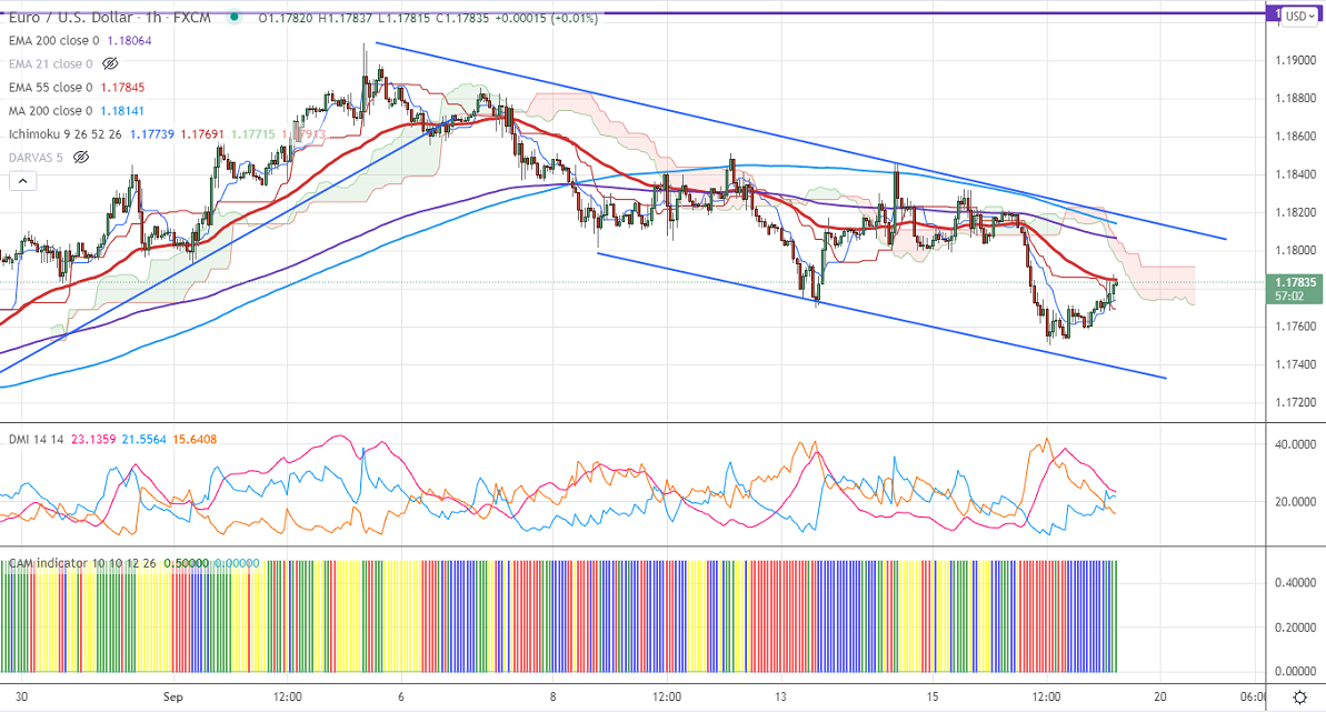 EURUSD halted its two-day losing streak and shown a minor pullback. The pair has fallen drastically yesterday after upbeat US retail sales data. The US headline retail sales rose by 0.7% in Aug compared to an estimate of -0.7%. The number of people who have filed for unemployment benefits jumped by 20000 to 332000 for the week ended September. The pair hits an intraday high of 1.17850 and is currently trading around 1.17781.