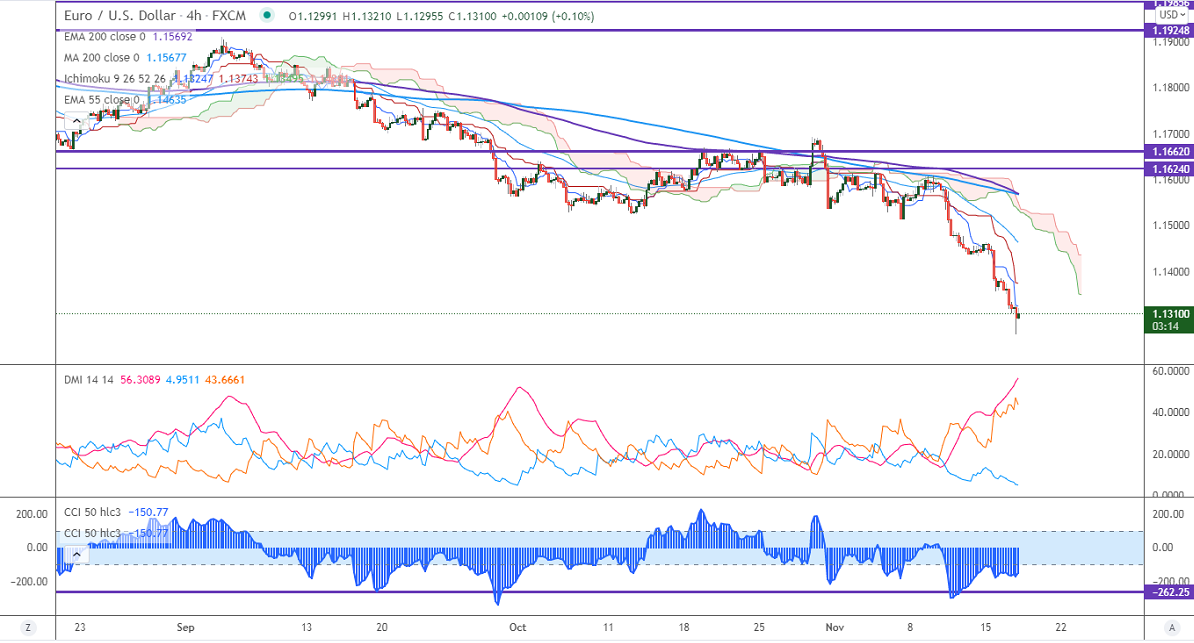 EURUSD declined sharply and hits 16- month lows at 1.12640. The upbeat US economic data and surge in US inflation have increased the chances of a rate hike by the Fed. The policy divergence between US Fed and ECB is supporting the US dollar. US retail sales rose 1.7% in Oct compared to the forecast of 1.4%. EURUSD hits an intraday high of 1.13210 and is currently trading around 1.13122.