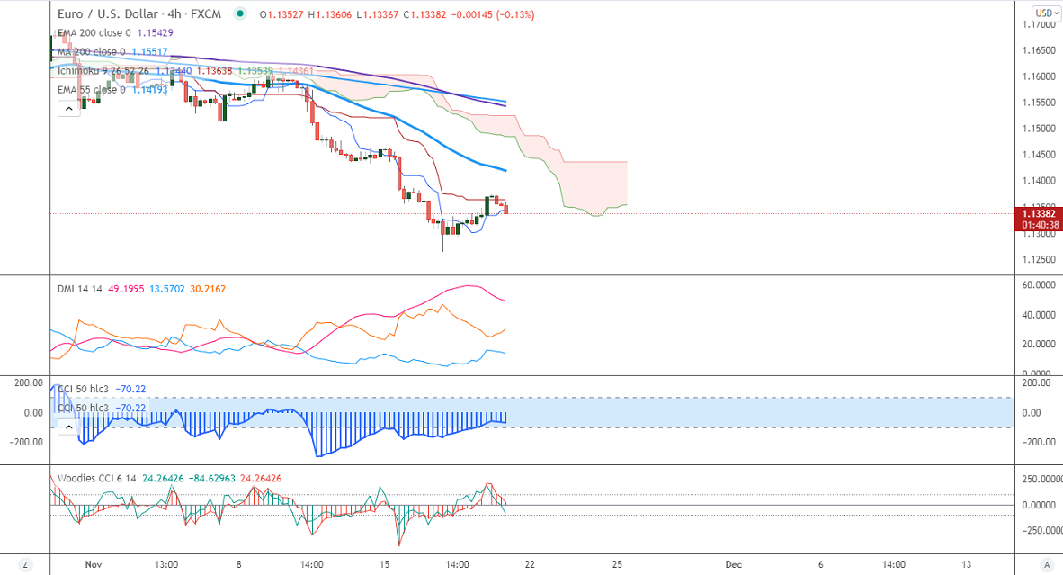 EURUSD has halted its minor pullback from a 16-month low of 1.12634. The slight jump in US treasury yield is supporting the US dollar at lower levels. The number of people who have filed for unemployment benefits for the week ended dropped by 1000 to 268000 previous weeks compared to forecast of 260000. US Philly fed manufacturing index rose to 39 in November vs. an estimate of 23. Markets eye US Fed speakers and ECB Lagarde's speech for further direction. EURUSD hits an intraday low of 1.13367 and is currently trading around 1.13420.